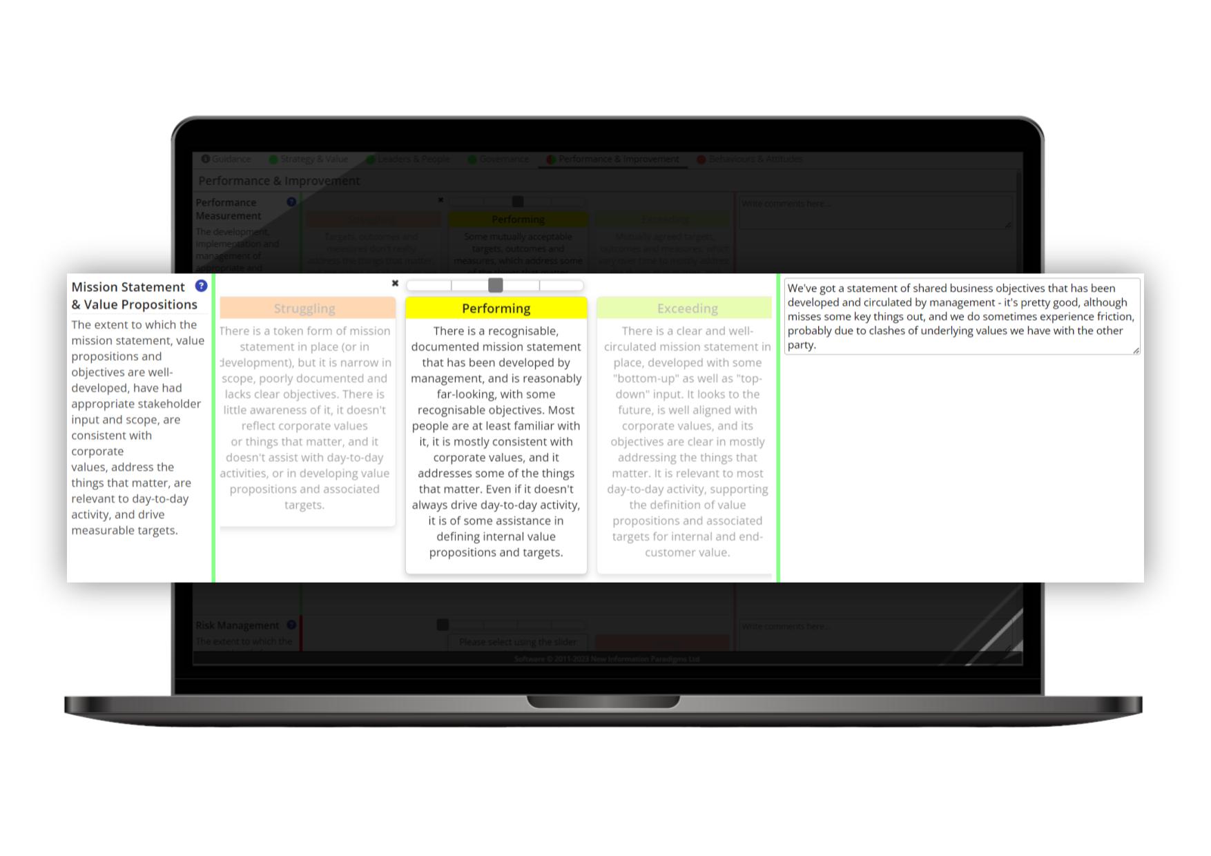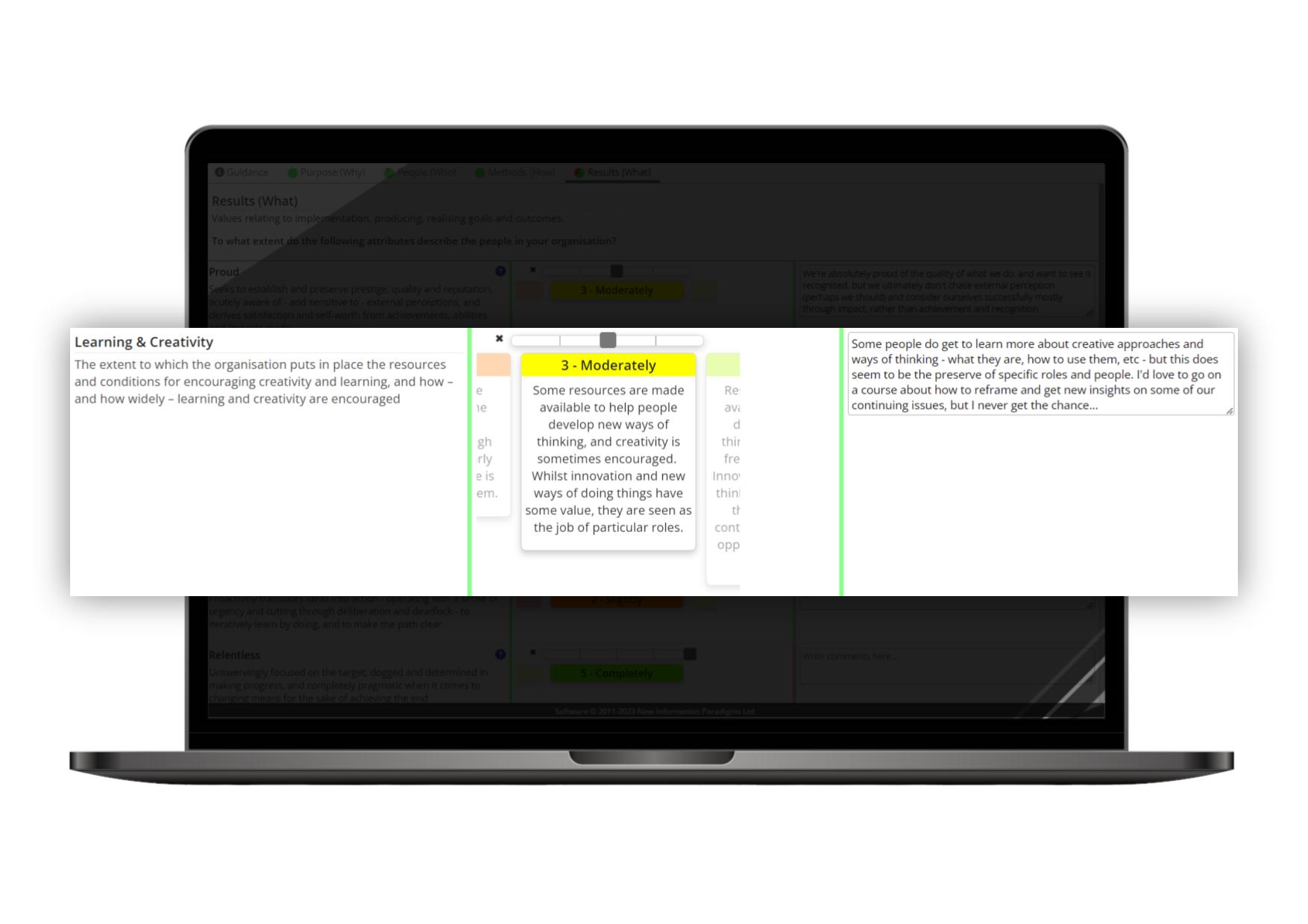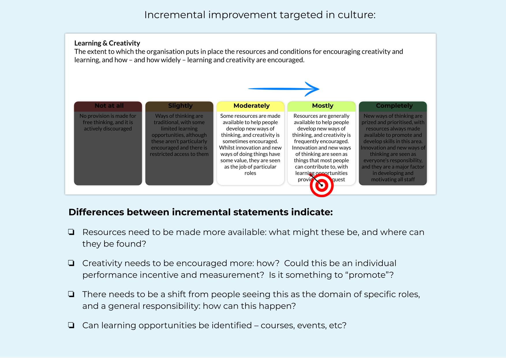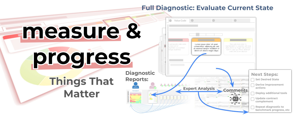Progress can be measured by regular repeats of the diagnostic, with new Things That Matter and associated Value Codes brought into scope as things adapt and improve – a process of engagement, motivation and change that achieves and demonstrates results.