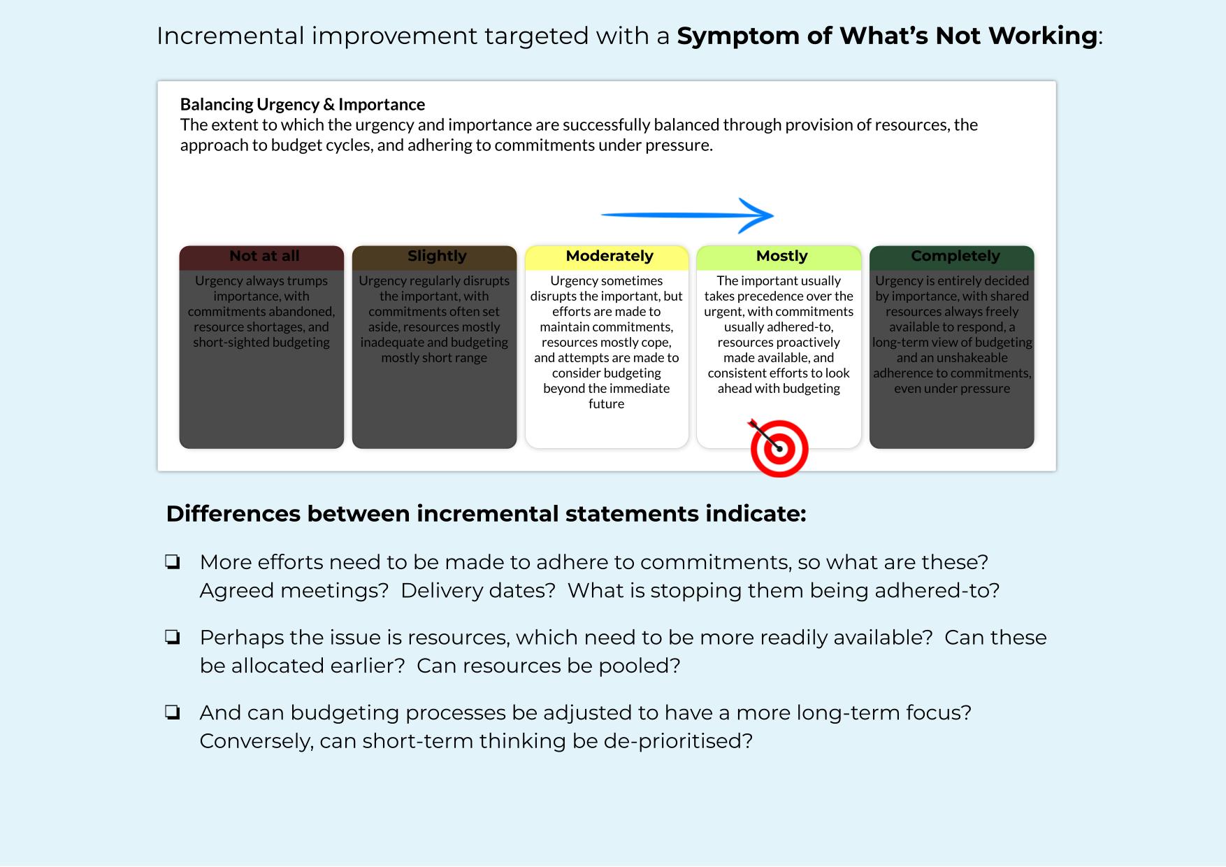 Experience therefore shows that the easiest and most effective way to begin scoping and surfacing the Things That Matter is to run a diagnostic, which achieves the difficult middle ground between the “extremes” of giving too much and too little as a starting-point.